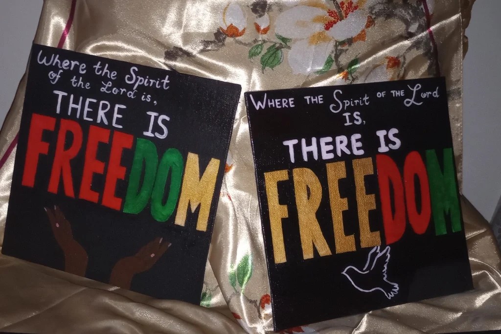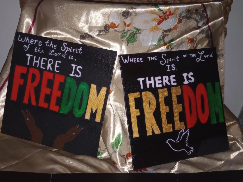“The Lady and the Sun Kisses” from the Painted Lady series. Acrylic on 18 x 24 canvas (2023)“The Lady and the Skyfall” from the Painted Lady series. Acrylic on 18 x 24 canvas (2023)“2 Corinthians 3:17” (Hands) and (Dove) from the Juneteenth Collection, Acrylic on 8 x 8 canvas with gloss finish (2023)“Run” from the Juneteenth collection, Acrylic on 8 x 8 canvas with gloss finish (2023)“Childlike Wonder”, Acrylic on 8 x 10 canvas with gloss finish (2023)“Compounded Seas”, Acrylic on 18 x 24 canvas (2021)